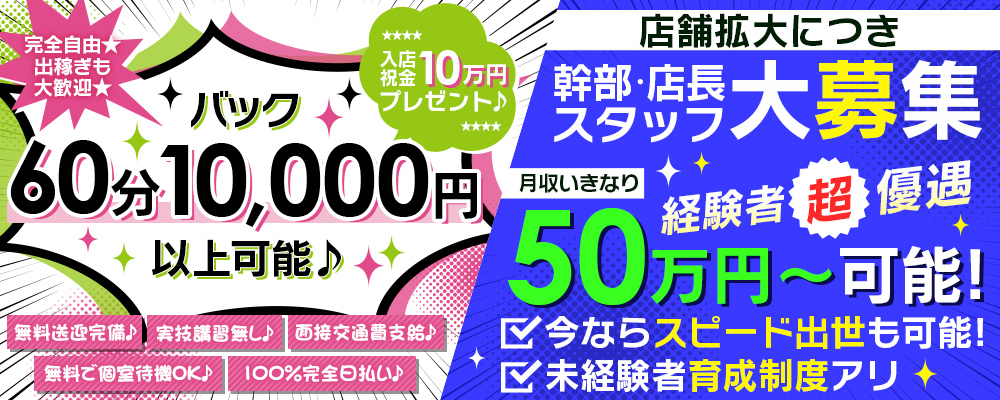 | 待遇 | 日払いOK・保証制度あり・アリバイ対策・寮完備・託児所あり・送迎あり・交通費支給・体験入店・未経験歓迎・個室待機・衛生対策・制服貸与・生理休暇・ボーナスあり・出張面接・面接交通費支給 |